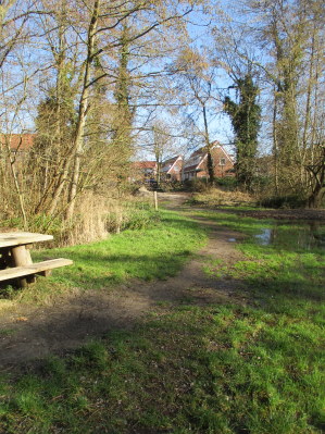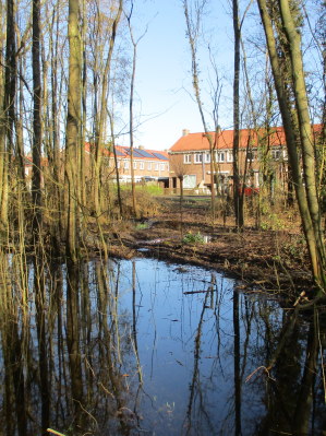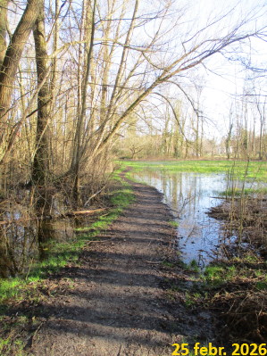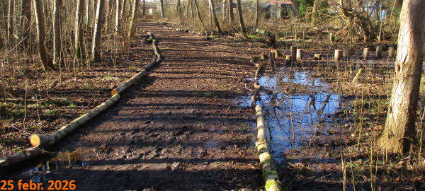 Het kan er extreem nat zijn. En het pad erlangs is met vele, vele kruiwagens zand opgehoogd, en ingeklemd tussen dikke boomstammen om zo hoog te kunnen storten. Zo'n pad verleg je dus niet zomaar eventjes. Er was over nagedacht, er waren jaarlijks foto's gemaakt, en er werd op basis daarvan jaarlijks een extra laag aangebracht. |