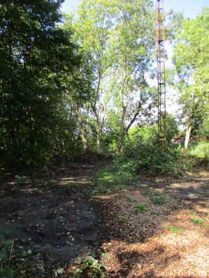 Hoe hoog we junglepad1 ook maken, de uitgang ligt er nu 20 cm te laag. Dus het pad loopt daar dood in de regentijd. De doorgang van junglepad I naar junglepad II (door de Spaanse aken haag) is tijdelijk geblokkeerd. Iedereen moet door het stinsenlaantje lopen naar het volgende veld. Dat laantje is een stuk breder geworden sinds de draglines er doorheen reden, en er ook meteen wat snippers op hebben gestort. Weer een bijna uitgeroeid biotoop (door verslemping en vermesting). Ik vind dat noch verbetering, noch herstel. De werkgroep Spoorzicht gaat met deze snipperhoop junglepad I ophogen, op termijn. |
