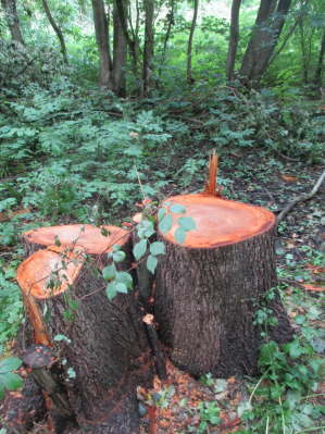 Al deze stammen zijn 's avonds na achten van het terrein afgevoerd. Ze waren te dik voor de versnipperaar (en geld waard). (En ze zijn, zo te zien, niet ziek.) |